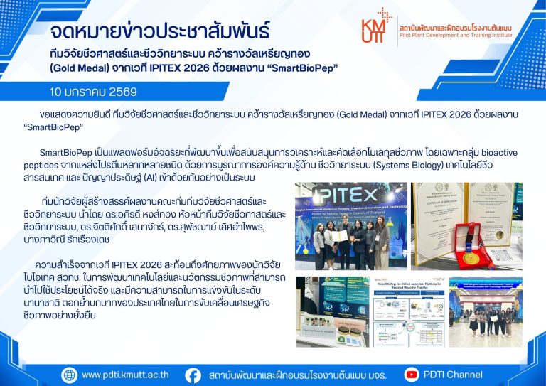 ขอแสดงความยินดี ทีมวิจัยชีวศาสตร์และชีววิทยาระบบ คว้ารางวัลเหรียญทอง (Gold Medal) จากเวที IPITEX 2026 ด้วยผลงาน “SmartBioPep”