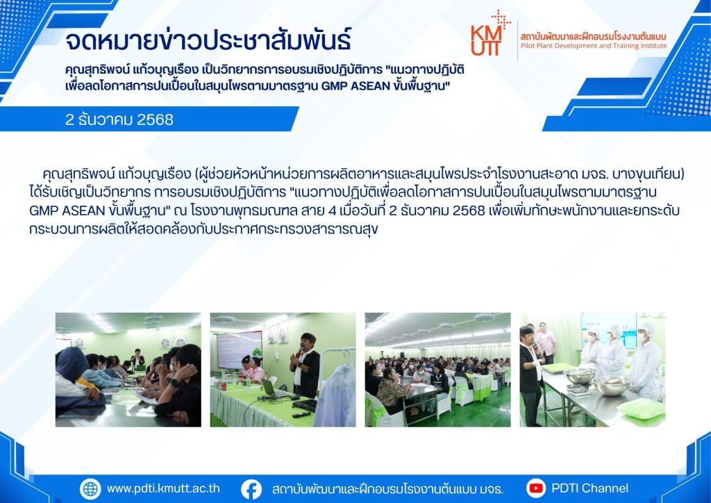 คุณสุทธิพจน์ แก้วบุญเรือง เป็นวิทยากรการอบรมเชิงปฏิบัติการ “แนวทางปฏิบัติเพื่อลดโอกาสการปนเปื้อนในสมุนไพรตามมาตรฐาน GMP ASEAN ขั้นพื้นฐาน”