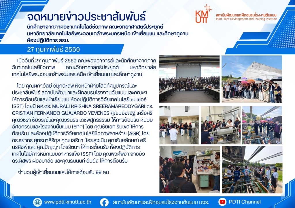 ภาควิชาเทคโนโลยีชีวภาพ คณะวิทยาศาสตร์ประยุกต์ มหาวิทยาลัยเทคโนโลยีพระจอมเกล้าพระนครเหนือ เข้าเยี่ยมชม และศึกษาดูงานห้องปฏิบัติการ สรบ.
