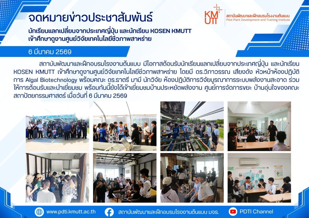 นักเรียนแลกเปลี่ยนจากประเทศญี่ปุ่น และนักเรียน KOSEN KMUTTเข้าศึกษาดูงานศูนย์วิจัยเทคโนโลยีชีวภาพสาหร่าย สรบ.