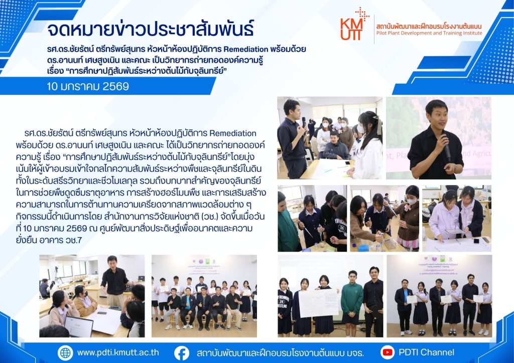 รศ.ดร.ชัยรัตน์ ตรีทรัพย์สุนทร หัวหน้าห้องปฏิบัติการ Remediation พร้อมด้วย ดร.อานนท์ เศษสูงเนิน และคณะ เป็นวิทยากรถ่ายทอดองค์ความรู้ เรื่อง “การศึกษาปฏิสัมพันธ์ระหว่างต้นไม้กับจุลินทรีย์”
