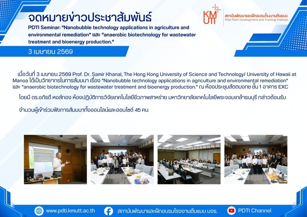 PDTI Seminar: “Nanobubble technology applications in agriculture and environmental remediation” และ “anaerobic biotechnology for wastewater treatment and bioenergy production.”